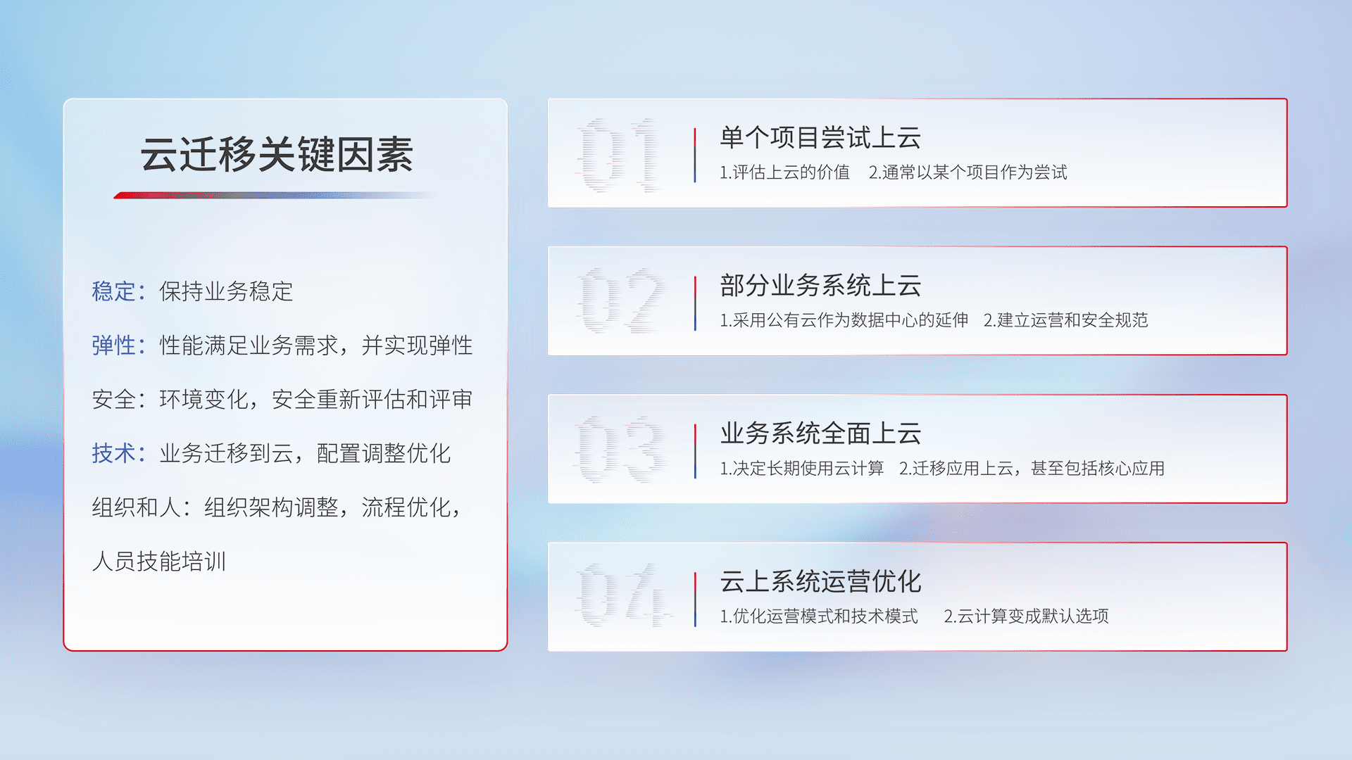 结合实际业务,,,,从规划设计、、、、云平台选型、、、、云原生改造、、、、数据迁移、、集成交付,,,,迁移全过程为客户识别最佳上云路径,,做好风险识别管理,,设计网络架构、、身份权限、、、、安全审计合规、、、操作审计、、、、日志审计、、、、监控告警策略、、、、多站点容灾设计等,,对云上基础设施进行整体规划,,提升IT治理水平,,,以满足弹性、、高可用、、、高性能的需求。。。。