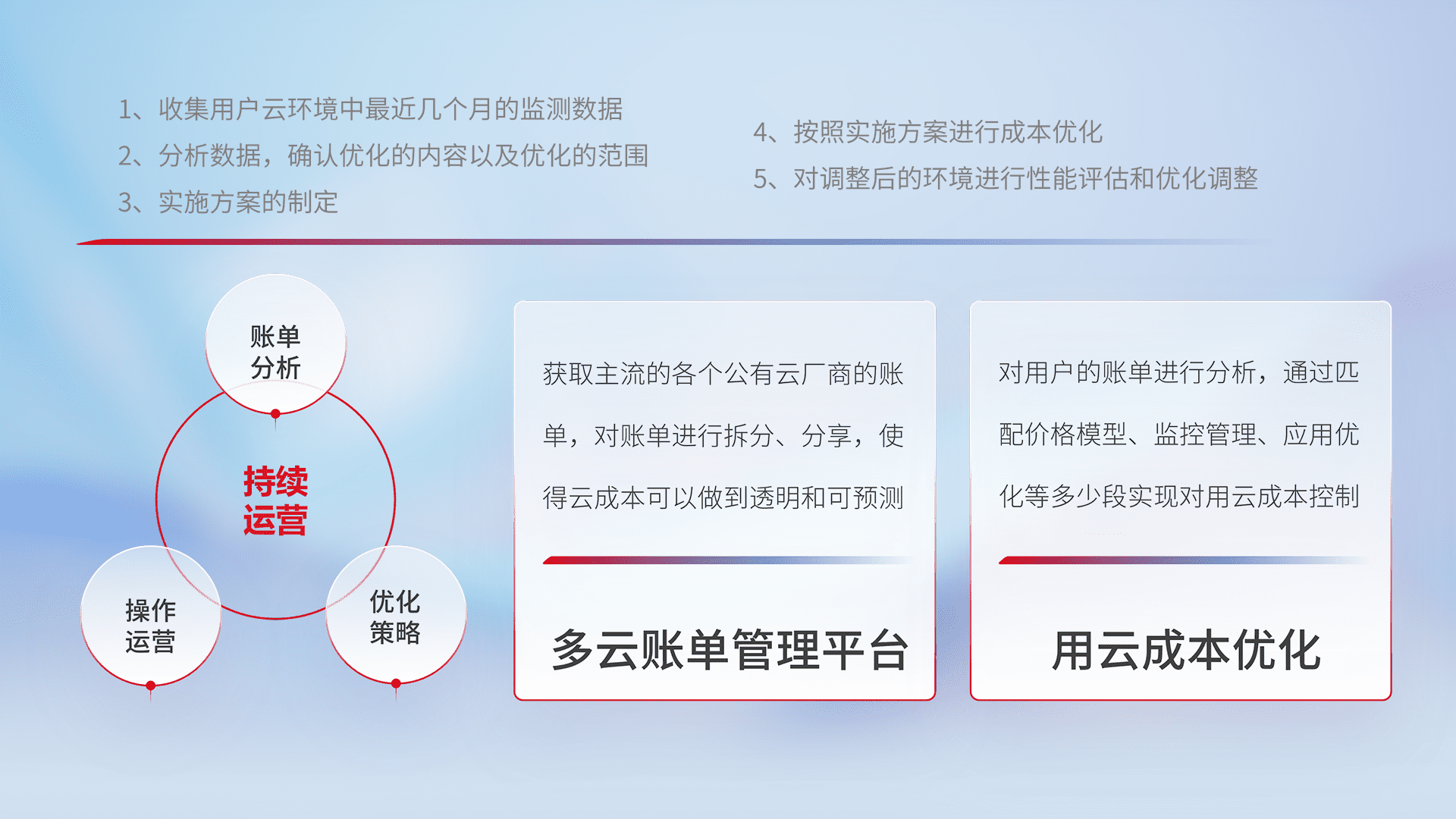 通过灵活运用多种自动化迁移工具,,,帮助企业用户实现业务和数据高效 、、、稳定的上云迁移和云上迁移,,采用自研多云纳管平台,,,,以中立管理模式,,,,解决多组织、、、、多云、、多运维厂商的复杂关系的管理,,,保证多云平台资源配置的一致性,,实时掌控云资源运行数据,,运用智能化工具分析云资源多云平台的管理服务,,,透明化管理成本支出,,,用云成本可预测、、、、用云费用可优化、、、、云资源配额有据可依。。。