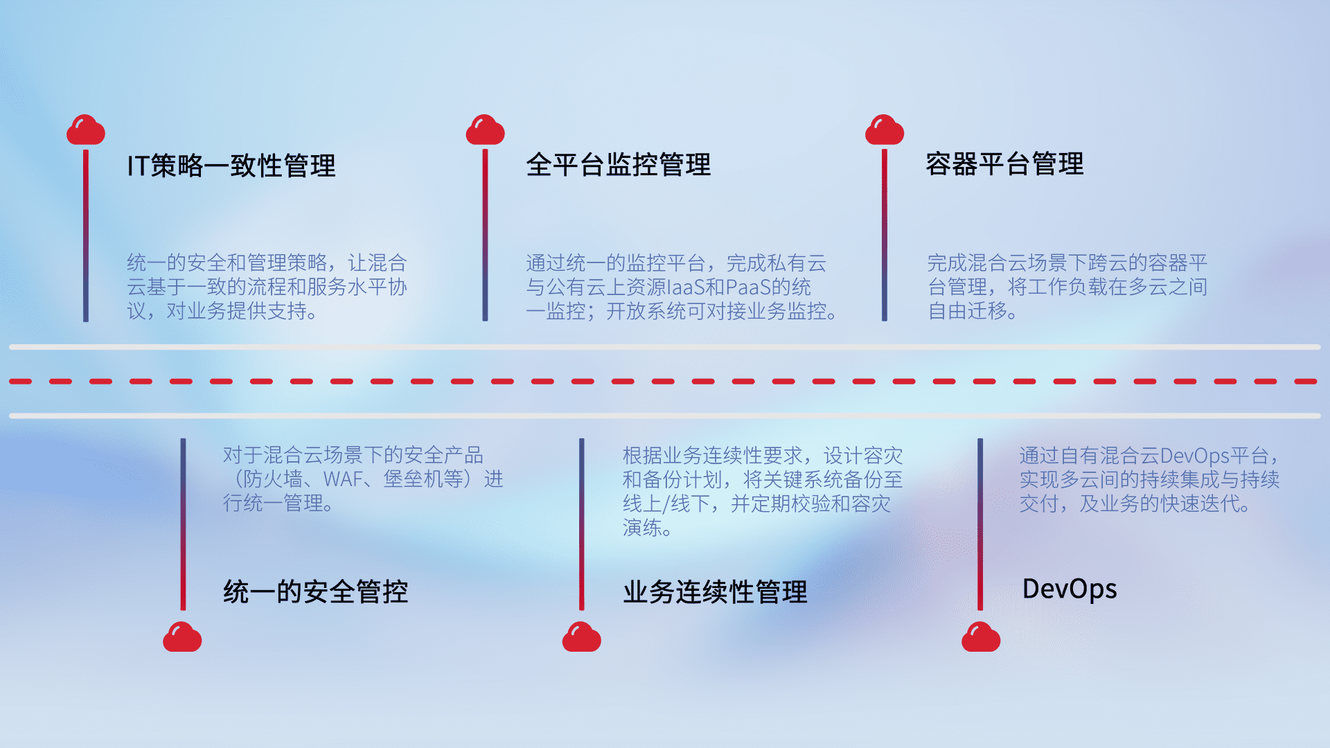 通过多云纳管,,以统一的资源数据模型把客户的云资源进行抽象和封装,,进而实现对多云资源的统一操作,,保障云资源管理的可靠性、、、、稳定性与可用性。。量身定制化运维内容,,配置、、开发运维、、、、补丁管理、、备份、、、监控、、认证和访问管理、、、审计和日常巡检等,,,保障在用云过程中的可靠度,,,稳定度以及高可用率。。