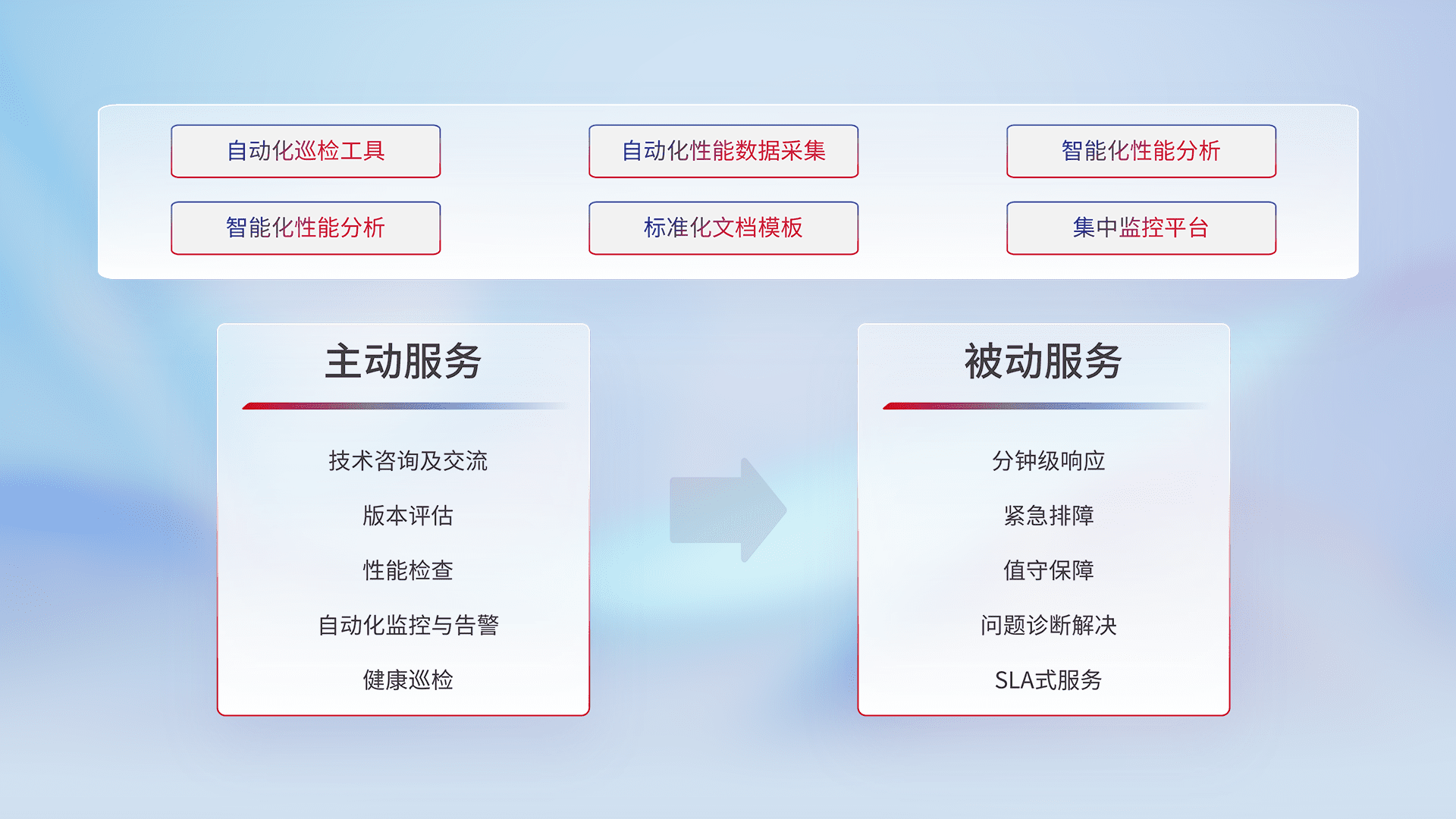 智能化工具和标准化文档,,,保障服务质量,,,,提供主动服务(包含技术咨询、、、版本评估、、、、性能检查、、自动化监控与告警、、、、健康巡检)和被动服务包含(分钟级响应、、、紧急排障、、值守保障、、、问题诊断解决、、、、SLA服务)。。。。