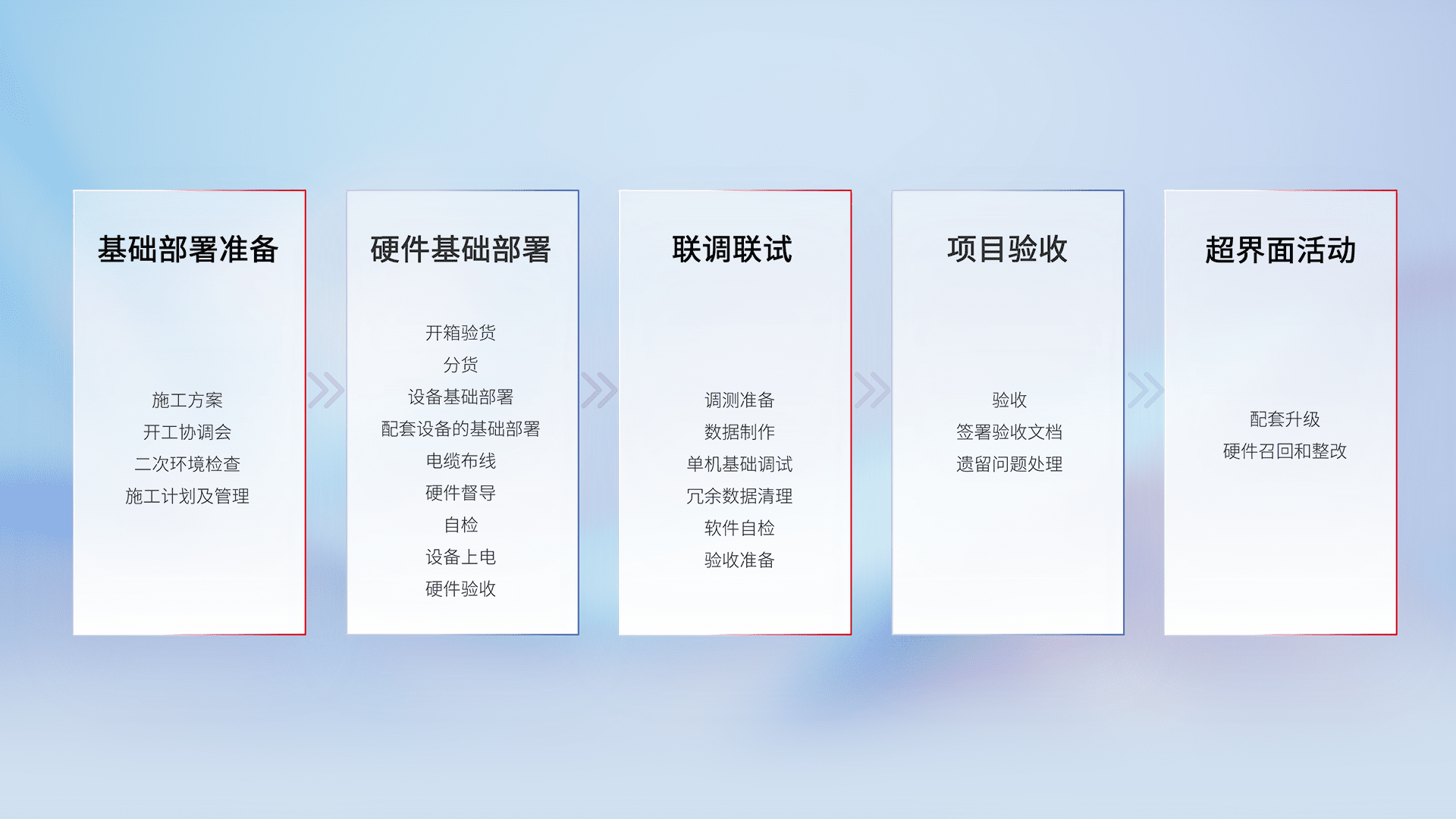 从基础部署准备、、硬件基础部署、、、联调联试、、、、项目验收、、、越界面活动的全过程可追溯,,保证施工质量和进度。。