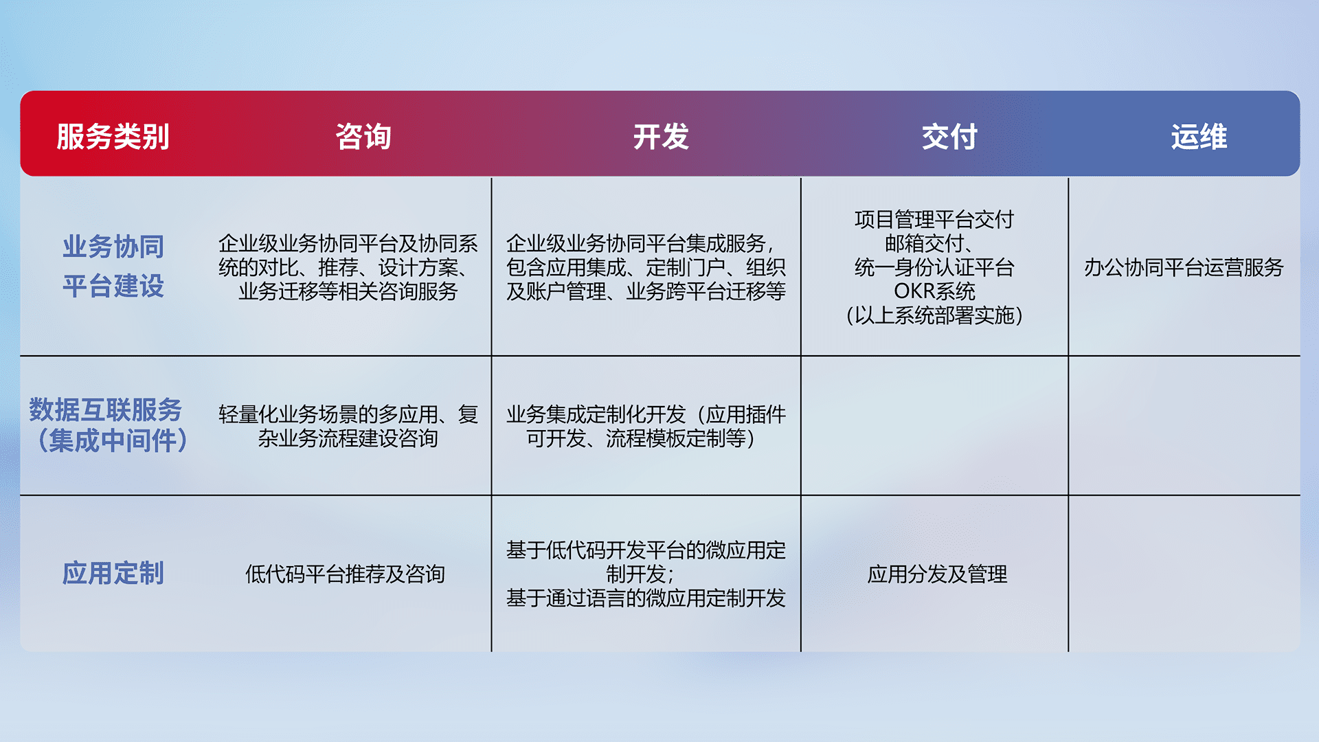 针对钉钉、、企微、、、IDaas等平台级产品提供产品的规划、、方案、、交付、、、、定制化开发等服务,,,,实现如统一协同办公、、、智能客户服务、、、混合会议管理、、智能数据查询、、、等业务场景,,,,实现数字化转型。。。
